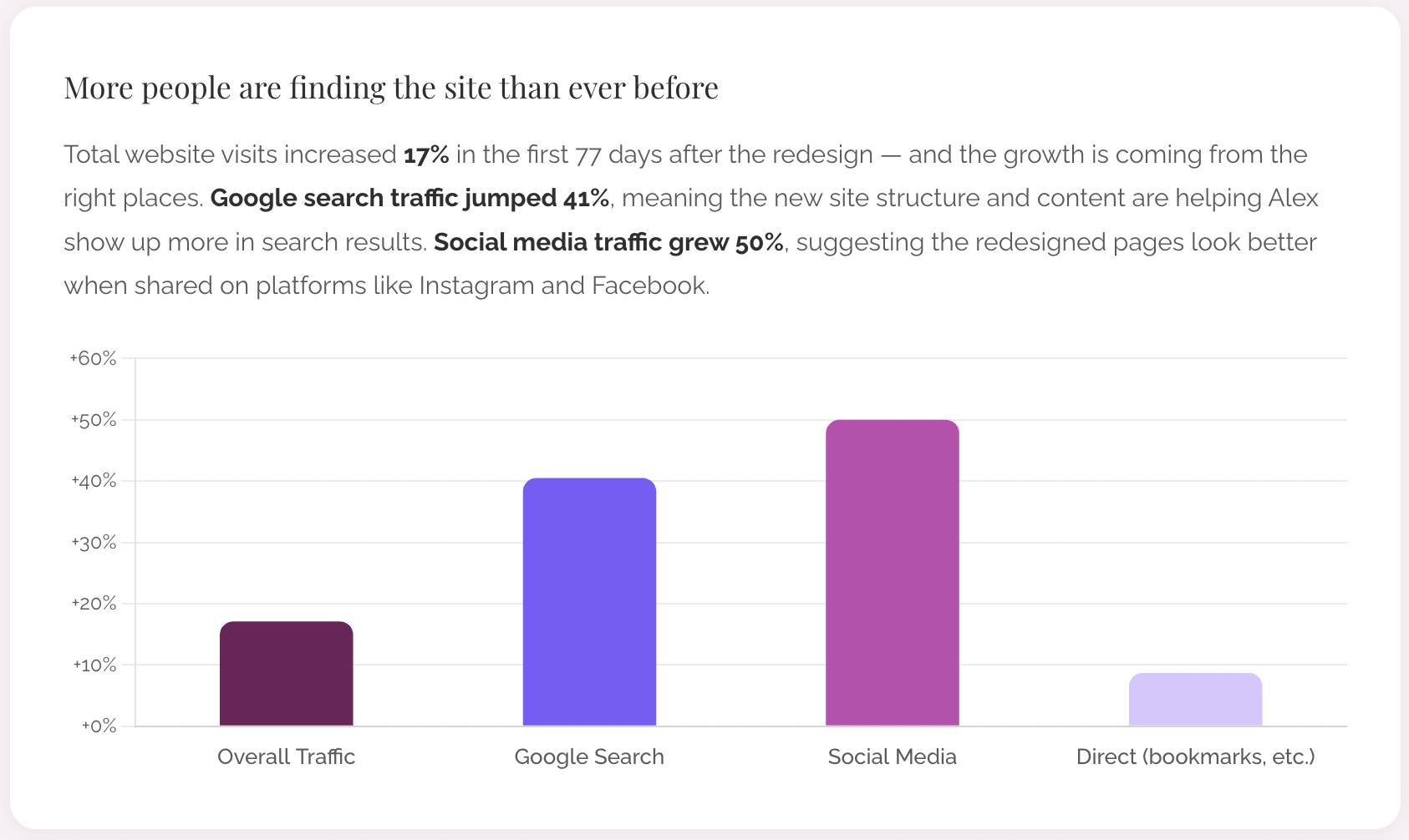 More people are finding the site than ever before. Total website visits increased 17% in the first 77 days after the redesign — and the growth is coming from the right places. Google search traffic jumped 41%, meaning the new site structure and content are helping Alex show up more in search results. Social media traffic grew 50%, suggesting the redesigned pages look better when shared on platforms like Instagram and Facebook.